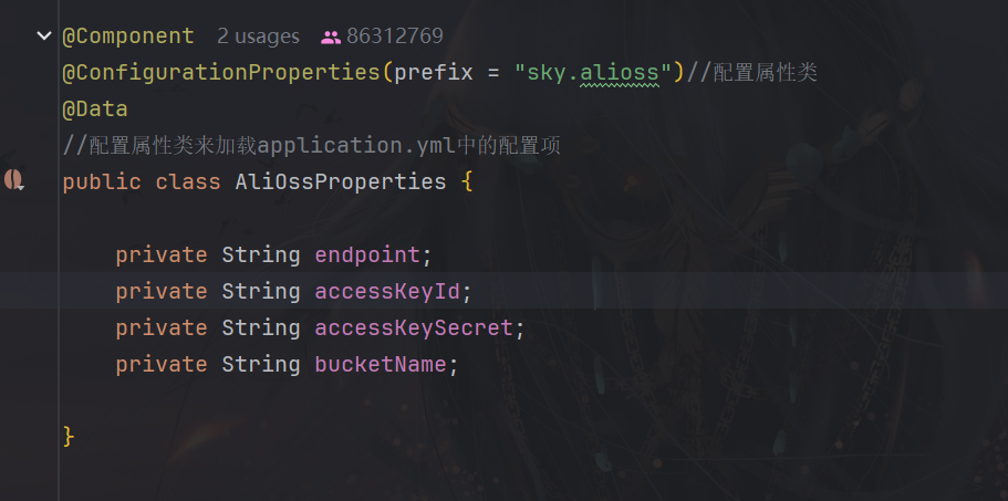 因为AliOssProperties有注解@ConfigurationProperties(prefix = “sky.alioss”)//配置属性类
