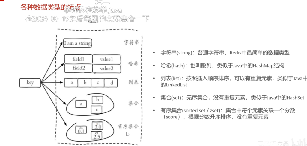 本次学习的五种数据类型:字符串 哈希 列表 集合 有序集合
