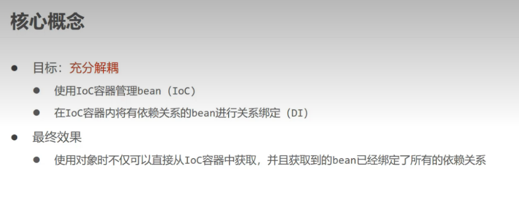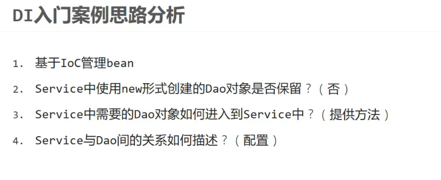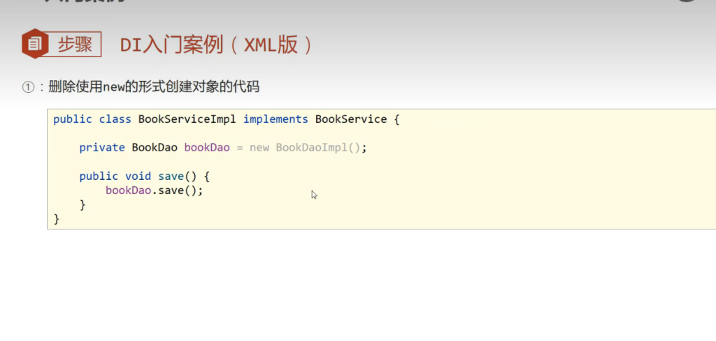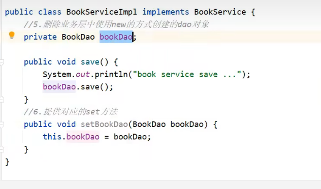 首先要把二者的bean对象交给IOC容器管理,其次代码中不要保留new的一些创建对象的代码了(保留耦合度必然高)