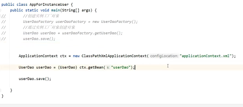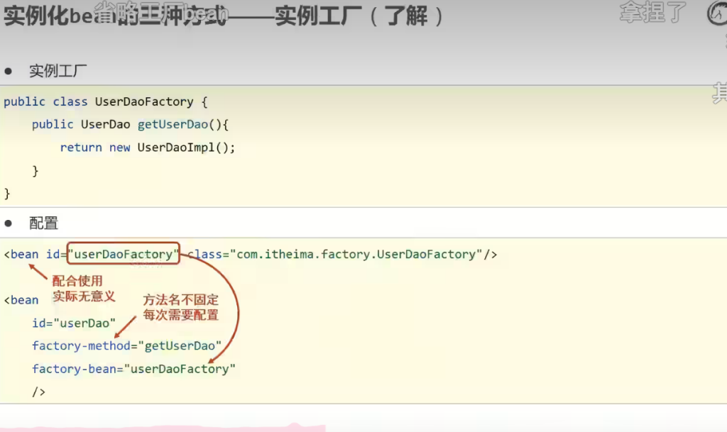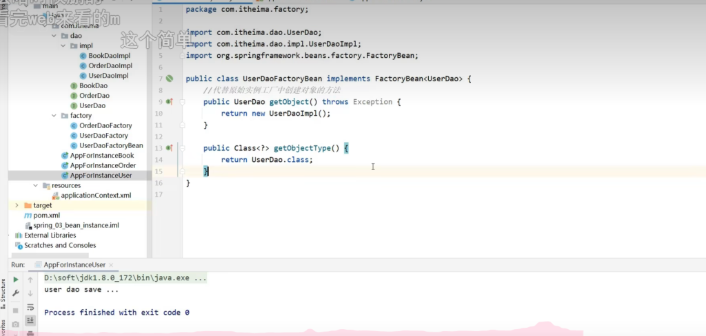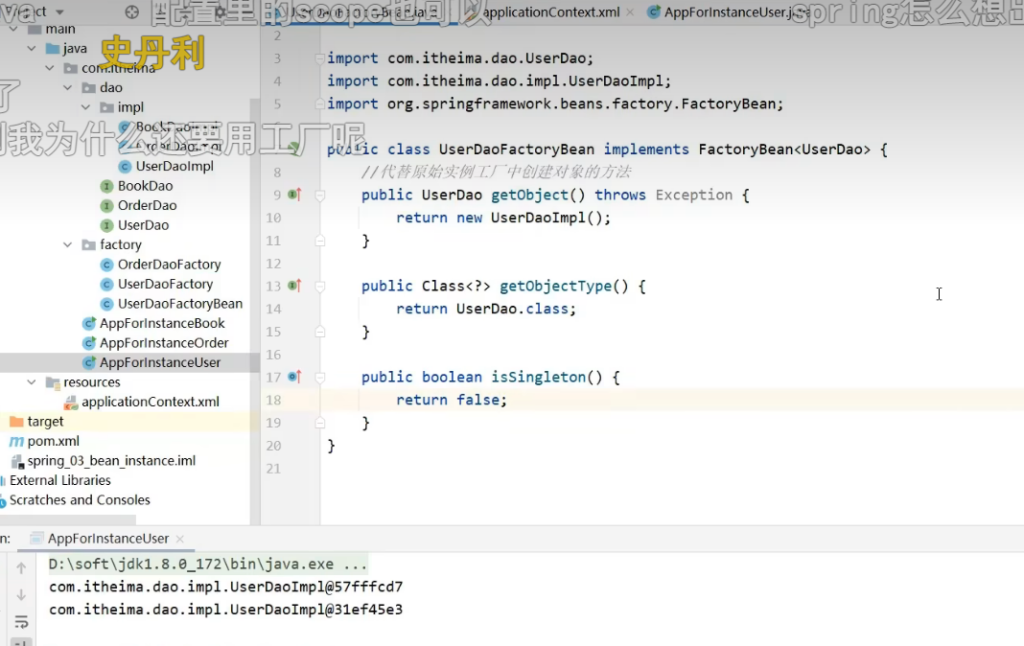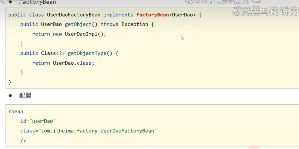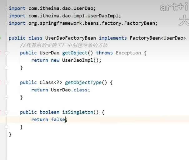专门创建一个工厂bean,这个bean去实现一个公用抽象类(泛型的话就填UserDao):FactoryBean<UserDao> 然后会实现两个方法,一个用来返回对象,UserDao里面的UserDaoiml