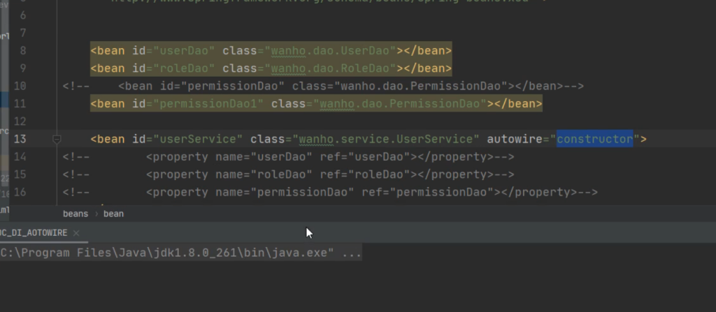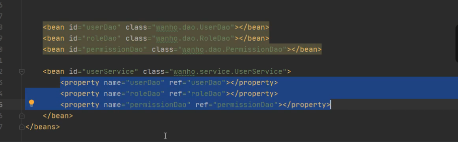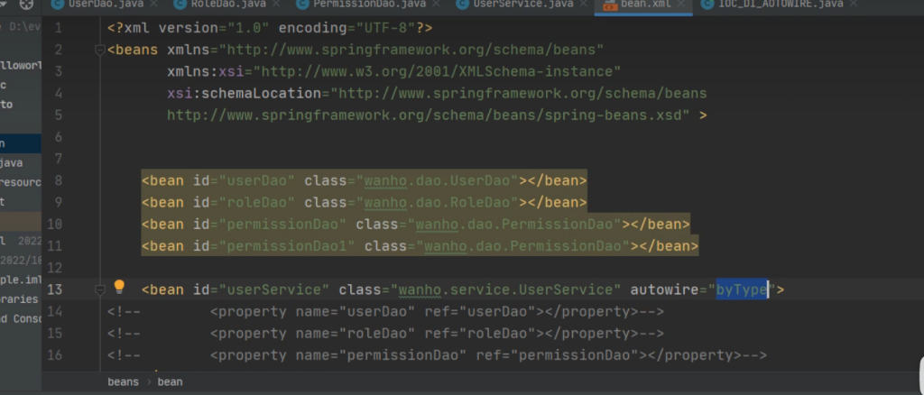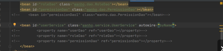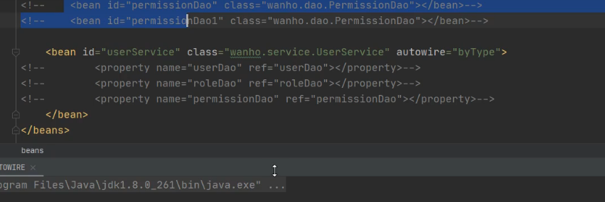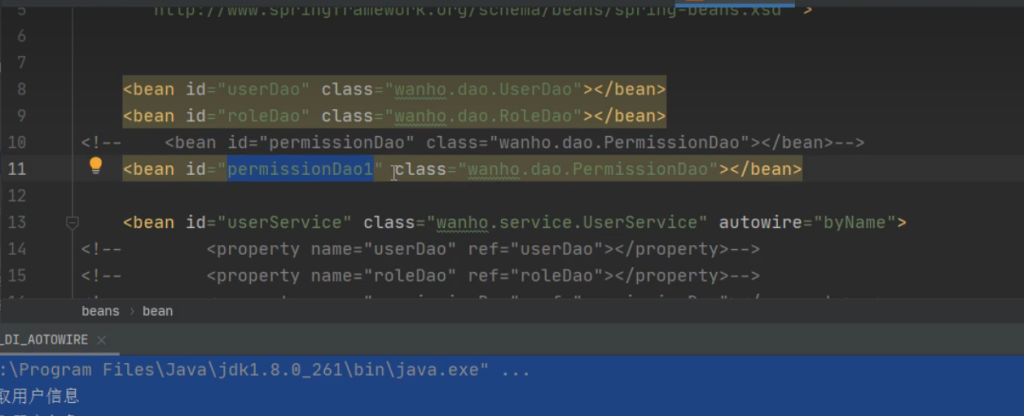 在装配之前其实UserService里就已经注入了几个Dao变量。所以它会根据变量去xml文件去找bean的配置文件,切相同类型的bean要唯一,不然会报错。