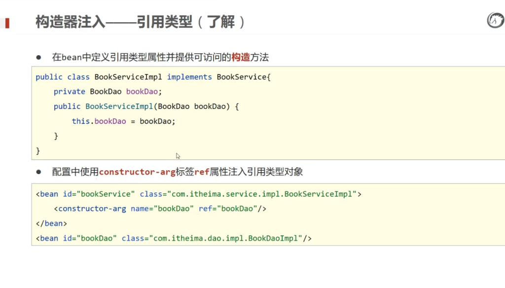首先你得有个实现类方法,然后可以通过构造器传入方法,那么构造器就是这样。注入Bean对象:private BookDao bookDao,然后有个构造方法,里面有个参数:BookDao bookDao,