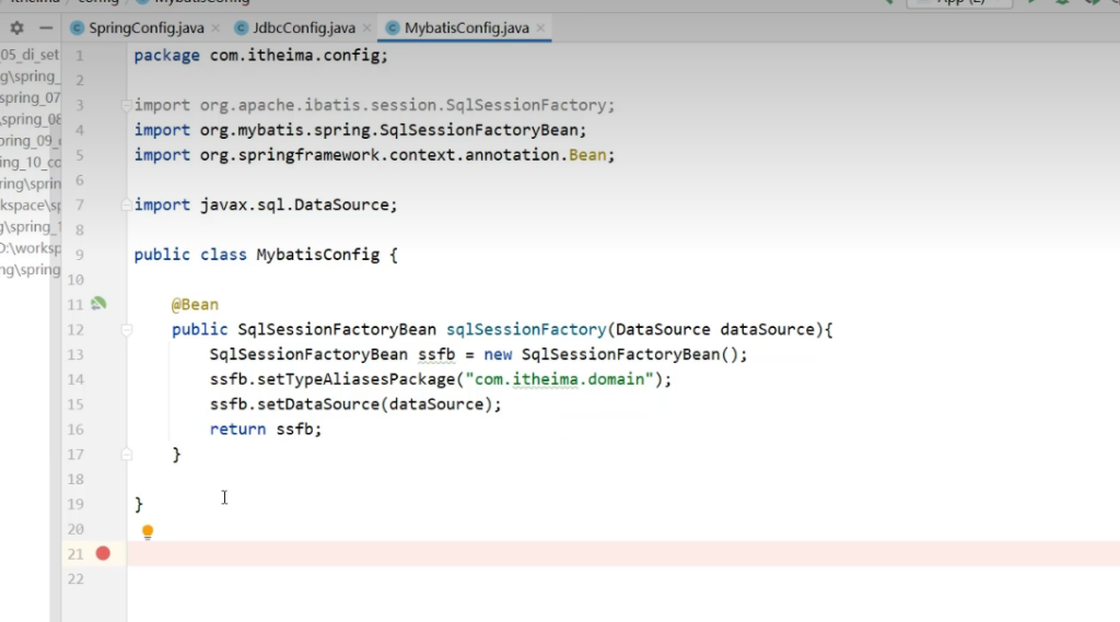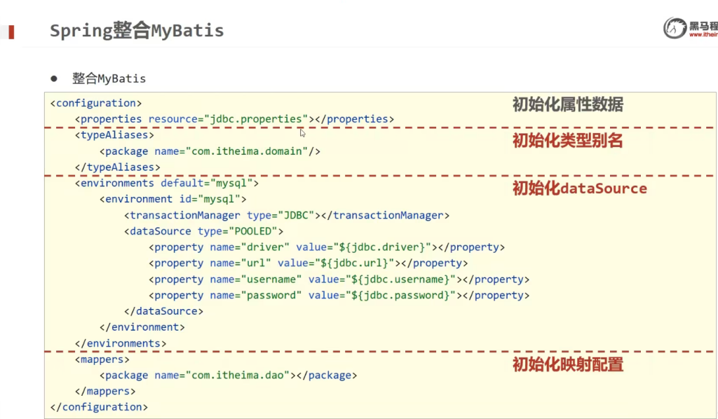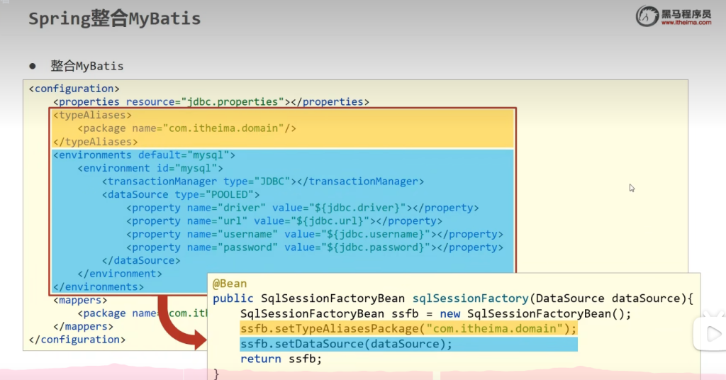 • 通常,SqlSessionFactoryBean的配置会与DataSource的配置一起,放在Spring的配置类中,以实现MyBatis与Spring的整合。