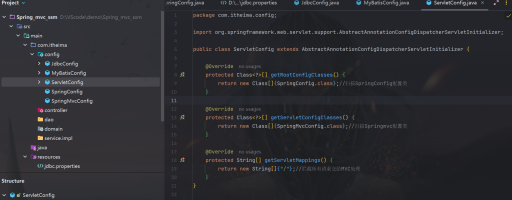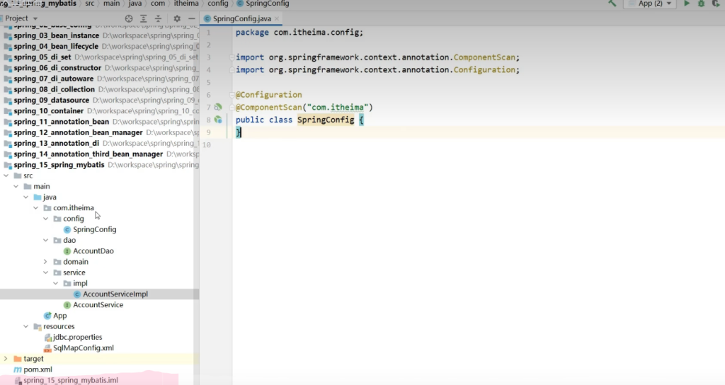 4. msc.setBasePackage("com.heima.dao");这行代码指定了Spring容器在初始化时需要扫描的包路径。MapperScannerConfigurer会扫描这个包及其子包下所有的接口,并自动注册它们为Spring的Bean。这些接口通常都是MyBatis的Mapper接口,用于定义SQL映射和操作数据库的方法。