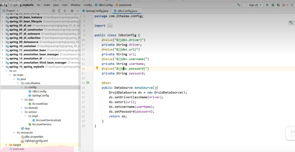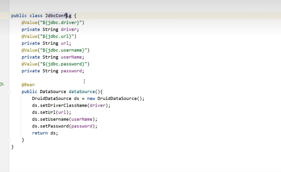 然后jdbcConfig上面要木加注解:@Configuration要么在Spring配置文件