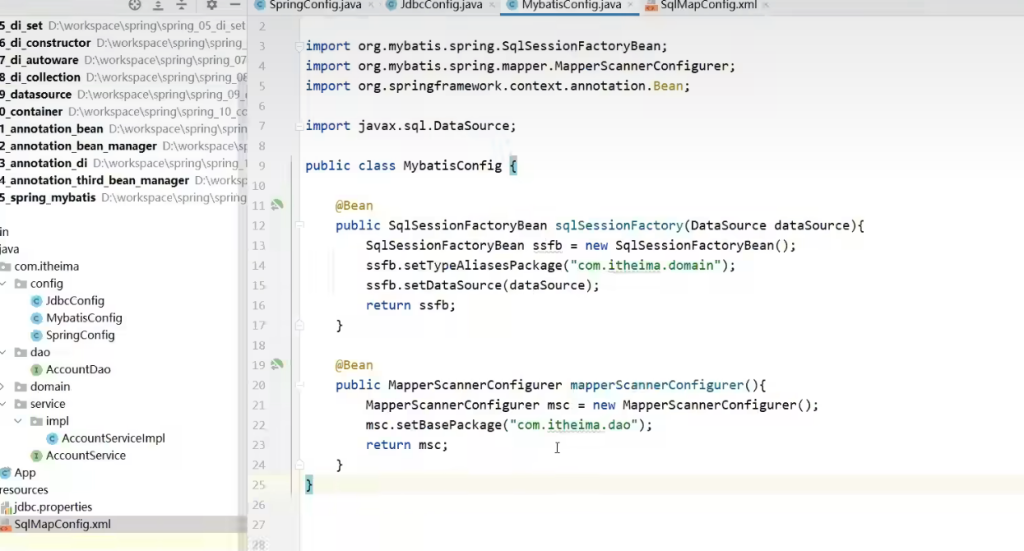 5. factoryBean.setTypeAliasesPackage("com.itheima.domain");这行代码告诉MyBatis扫描com.itheima.domain包下的所有类,并为它们创建别名。这样,在MyBatis的映射文件或注解中,就可以使用类名(不带包名)作为别名来引用这些类。