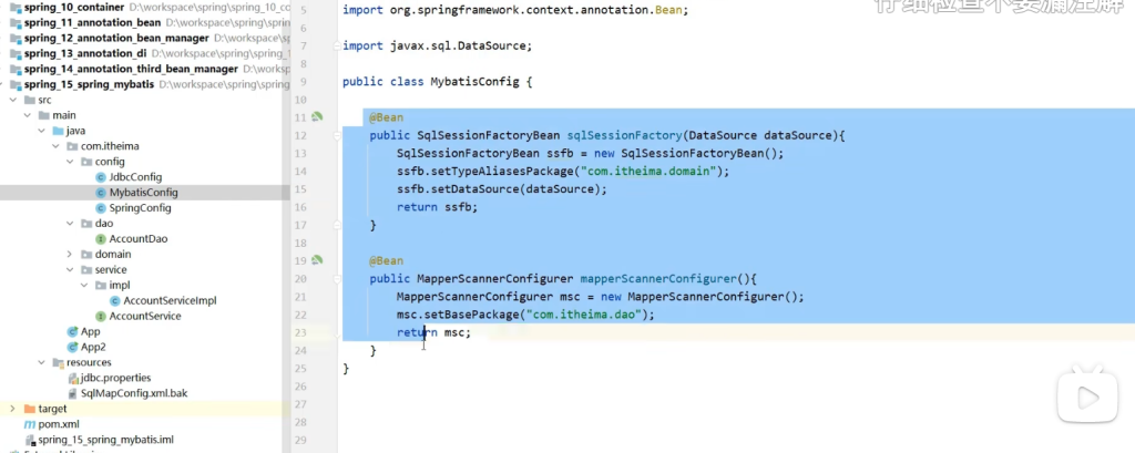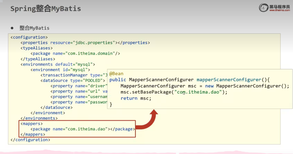 • 通常,MapperScannerConfigurer的配置会与SqlSessionFactory的配置一起,放在Spring的配置类中,以实现MyBatis与Spring的整合。